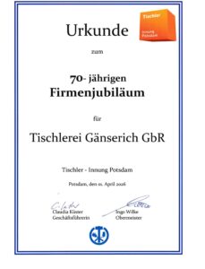 - am 01. 03. 2007 übernahmen wir – Thomas Gänserich und Beate Gänserich-Schulz – von unserem Vater die Firma, gründeten die Tischlerei Gänserich GbR und sind heute ein erfolgreiches Familienunternehmen in der 3. Generation