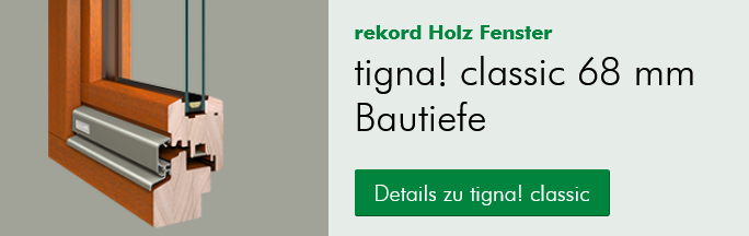 tigna! classic ist das bewährte Holz Fenster von rekord. Bewusst setzt rekord auch hier bei der Herstellung auf die Kombination aus traditionellem Handwerk und perfekter Technkik. 68 mm Bautiefe erfüllen nahezu alle Anforderungen und bieten nicht nur Stabilität, sondern auch ausgezeichnete Qualität. tigna classic bietet hohen Komfort und Designvielfalt und ist auch bei der Wärmedämmung ganz vor mit dabei. Denn bei rekord gehört eine hoch entwickelte Isolierverglasung mit einem niedrigen Wärmedurchlass-Wert von 1,1 W/m²K bereits zum Standard. Durch das natürliche und langlebige Material sorgt das Holz Fenster für ein gesundes Wohnklima und maximalen Raumkomfort.